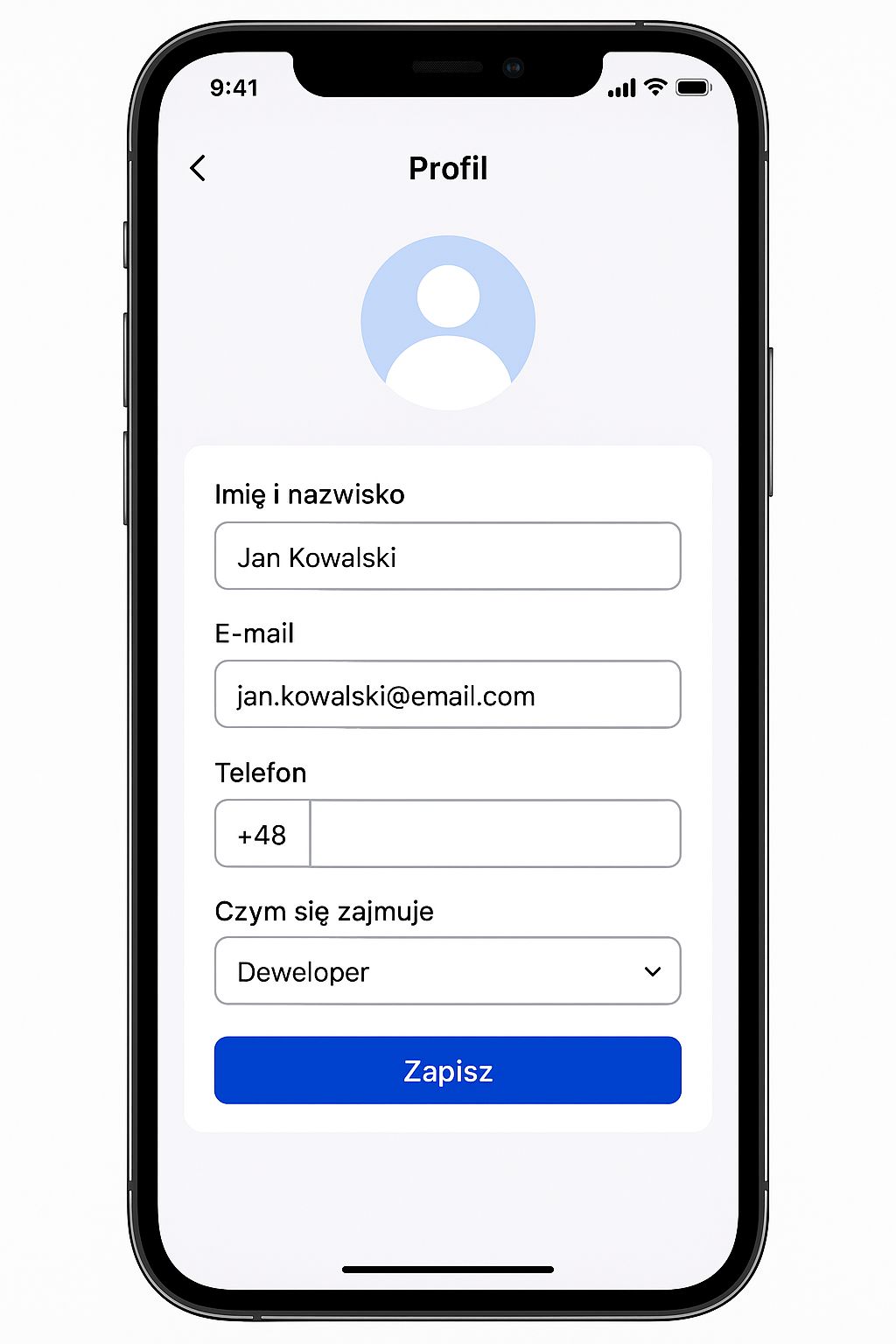 ✅ Każdy użytkownik aplikacji (np. klient, partner biznesowy) może założyć profil.